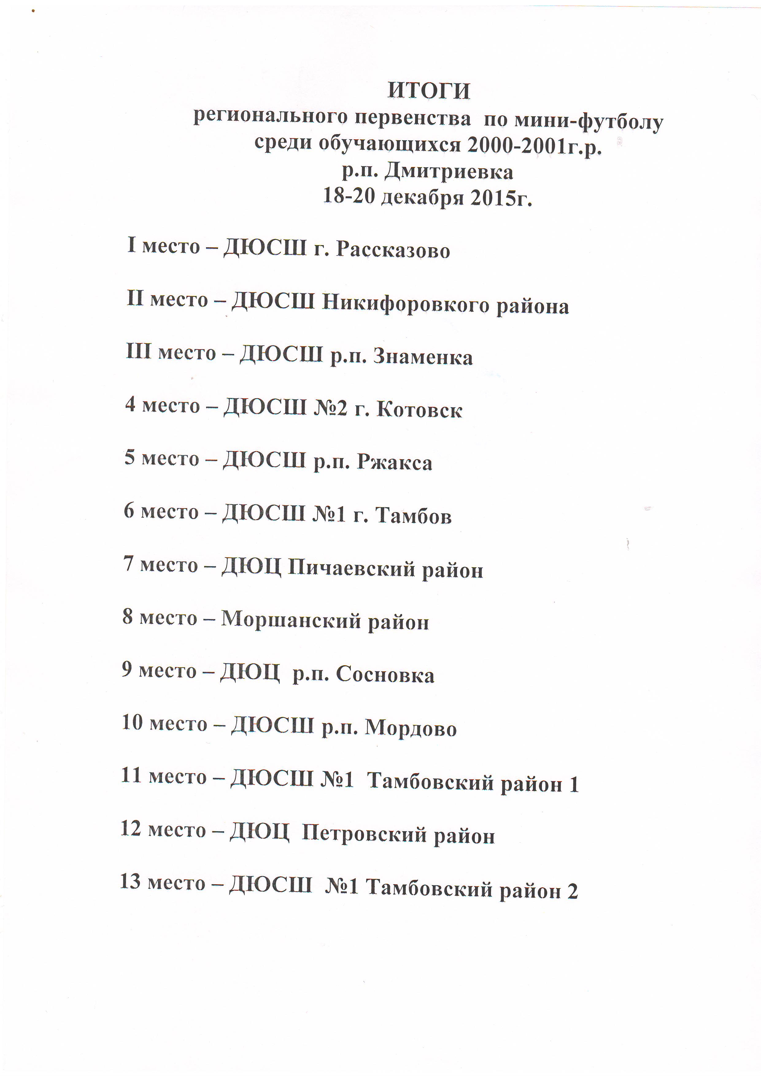 24-26 сентября 2014 г. в р.п. Первомайский проходило первенство области по футболу среди учащихся ДЮСШ 2002 г.р. и моложе. В соревнованиях приняли участие 8 команд детско-юношеских спортивных школ области: ДЮСШ Мичуринск, ДЮСШ Моршанск, ДЮСШ Первомайский, ДЮСШ Сампур, ДЮСШ Знаменка, ДЮСШ Старо-Юрьево, ДЮСШ Сосновка и наша ДЮСШ. В результате жеребьевки команды были разбиты на 2 подгруппы. В своей подгруппе наша команда выиграла все встречи и заняла первое место, обыграв команды: Сосновки 4:0, Сампура 2:0 и Знаменки 3:0. В полуфинале наши ребята встречались со второй командой первой подгруппы, ДЮСШ г. Мичуринск. В основное время матча счет был ничейным 1:1. Все решила серия послематчевых пенальти, в которых наши ребята победили со счетом 4:3 и вышли в финал.